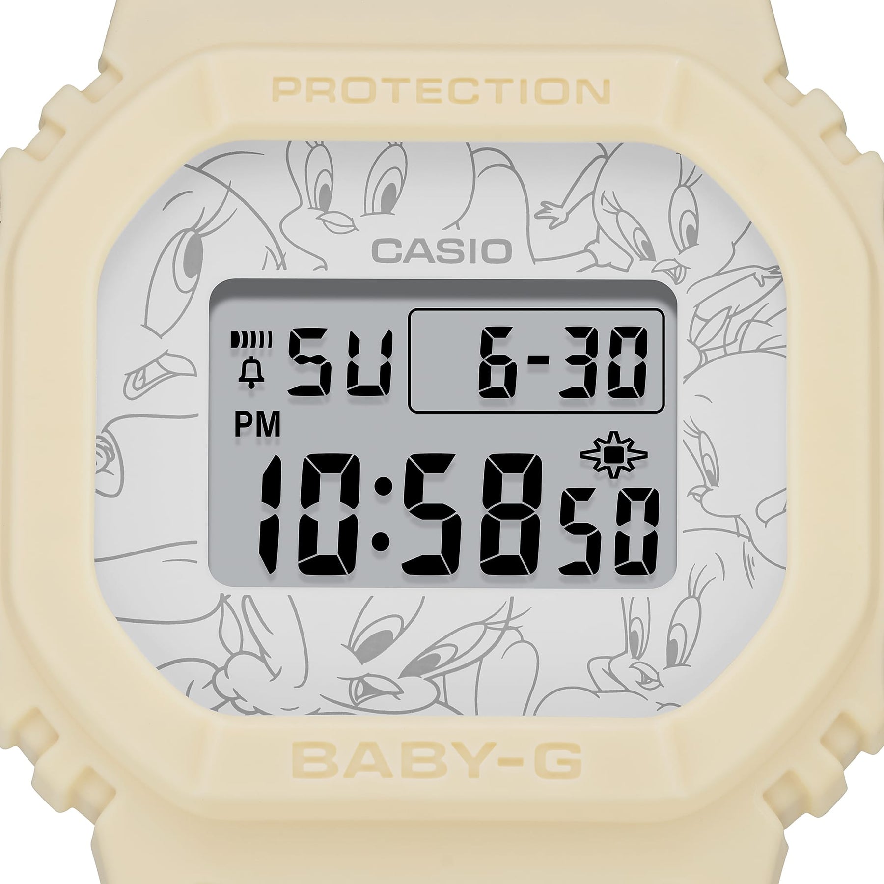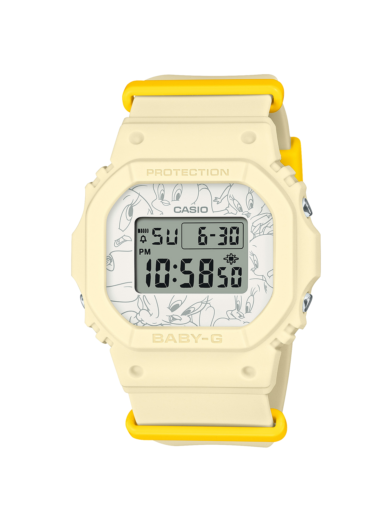 The BGD-565 and its classic angular form goes delightfully retro in matte beige. The band loop and rings in canary yellow are a nod to the cartoon bird, as is the “TWEETY” logo printed on the band. The watch face features an original BABY-G collage of Tweety’s many adorable expressions. Press the button to activate the LED backlight and his silhouette appears on the LCD. The case back is engraved with Tweety in his most iconic pose.