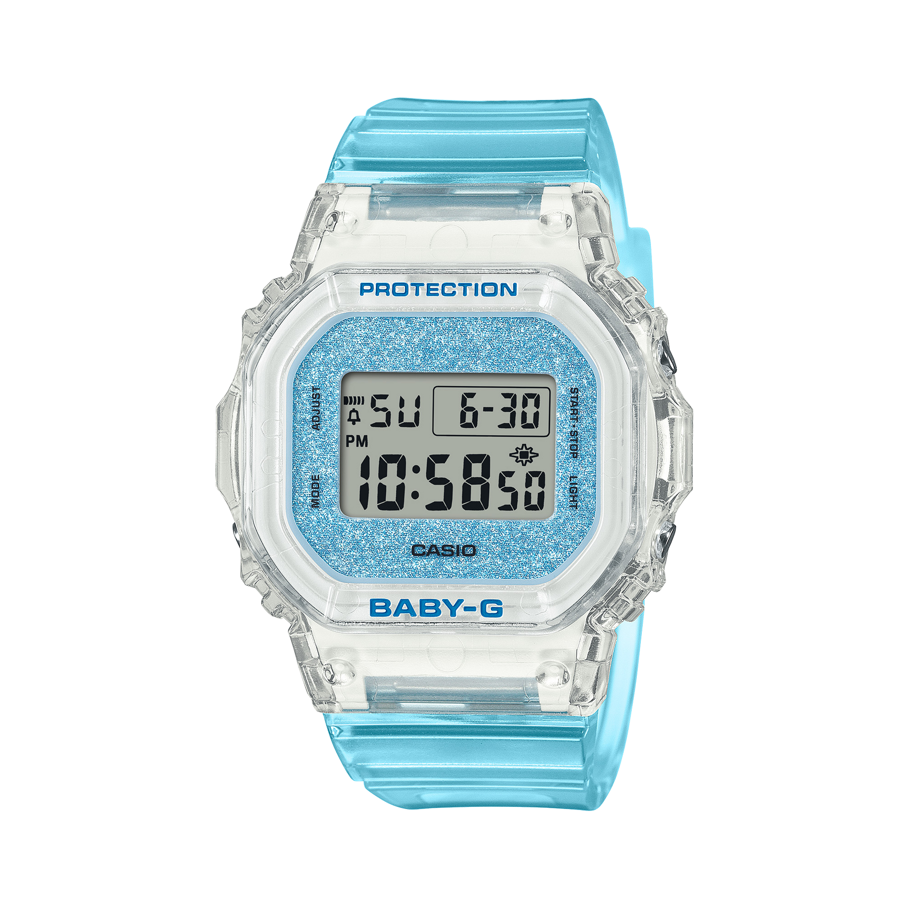 While maintaining the compact, angular style of the BGD-565, this BABY-G takes on see-through colour with a bezel and band in translucent resin and glittering dial for an added touch of luxe flair.