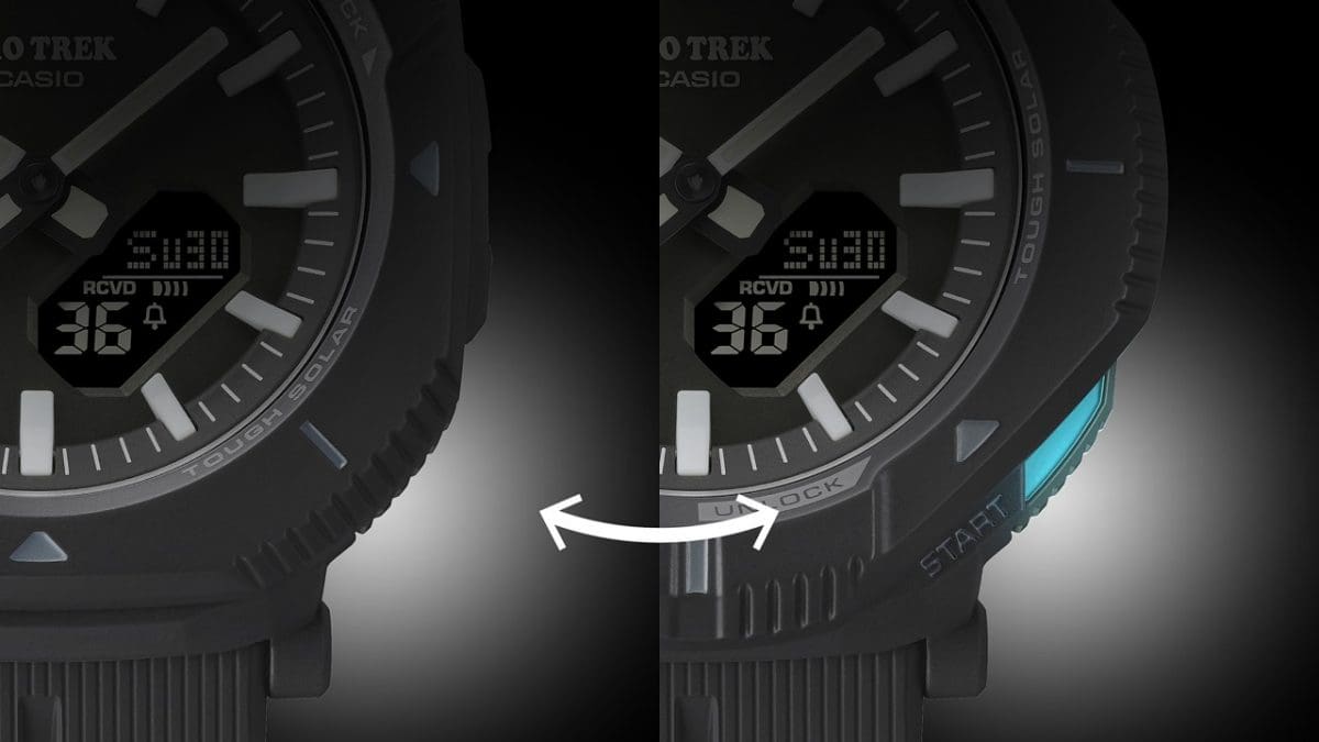 The PRJ-B001 takes it up a notch with the first rotary guard bezel in the PRO TREK line. Turn the rotating bezel to switch between two distinct styles. When set to present a stylish angular design that complements everyday fashion, the bezel covers the buttons, preventing accidental pressing of buttons while out walking or in town. Turn the bezel 45 degrees to the rounder look and uncover the buttons for easy access to functionality while out hiking or training.