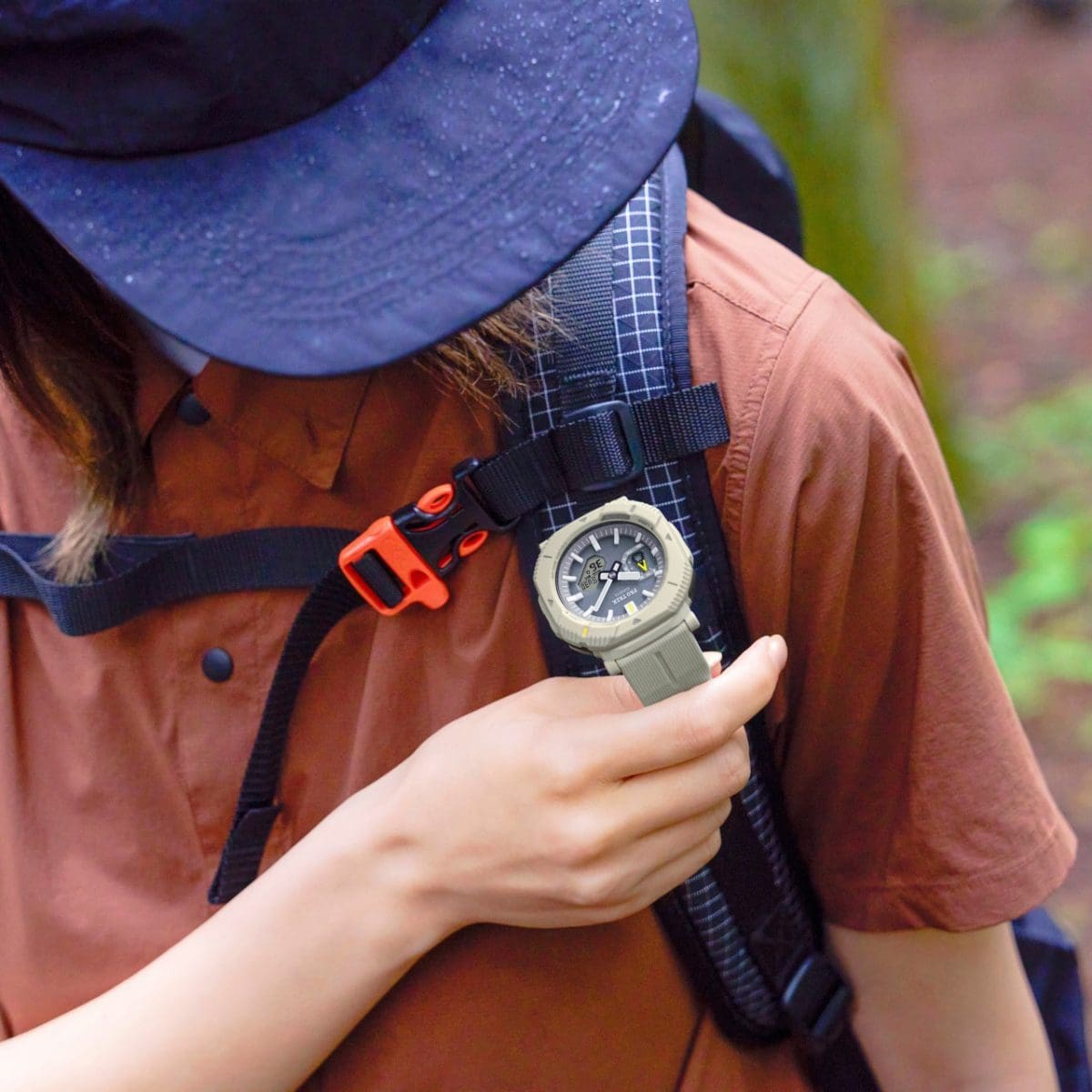 The watch features a soft urethane band for stress-free wear even over long stretches of hiking.