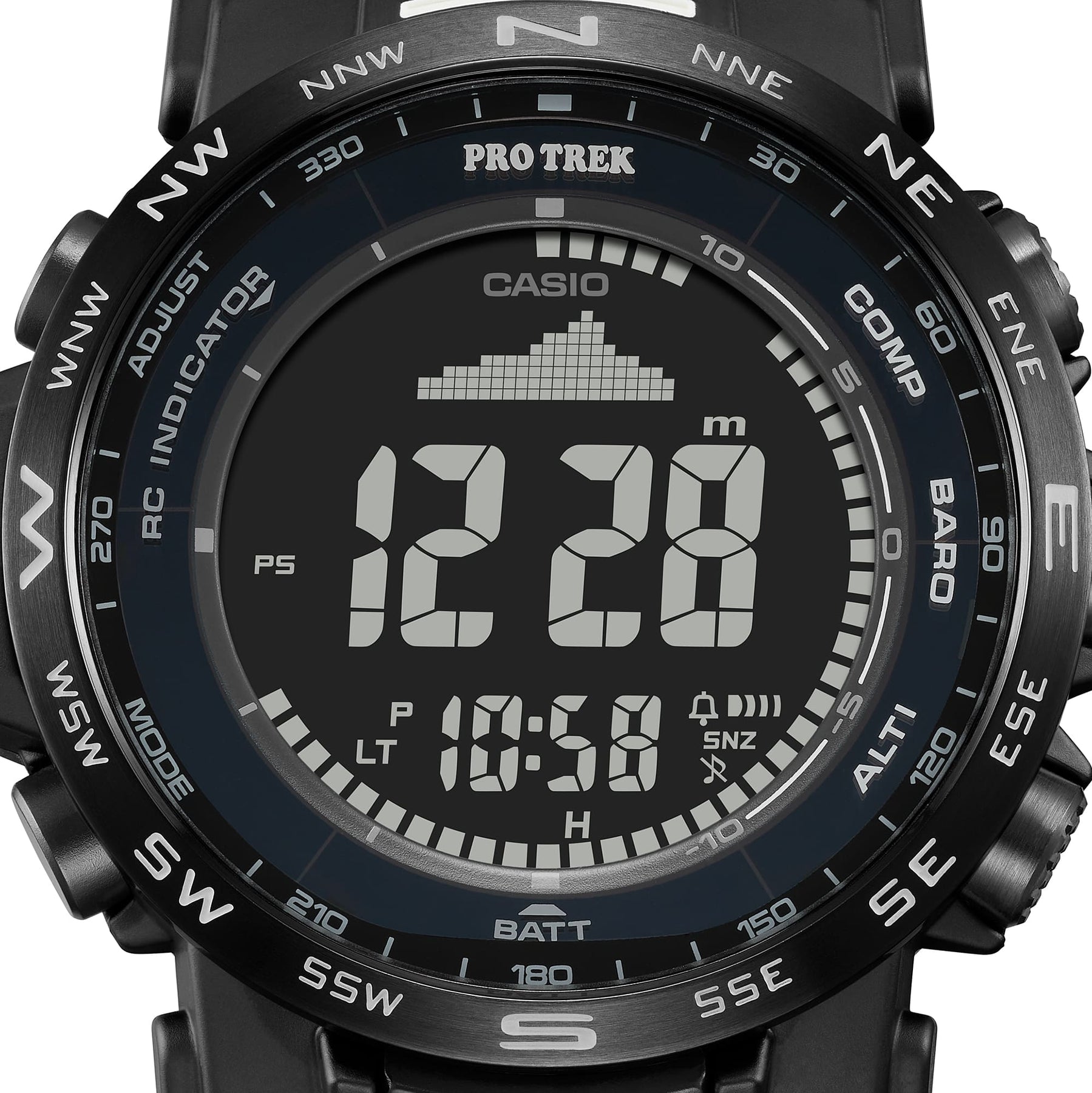 Simply push the large dedicated buttons along the right side of the case to check compass bearing, barometric pressure/altitude, and temperature. The mode name is shown near each button so you know at a glance which digital reading is displayed. The super-twisted nematic (STN) LCD and large, bold digital readout deliver excellent readability wherever you find yourself, even in the harshest terrains.